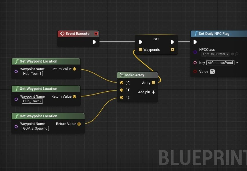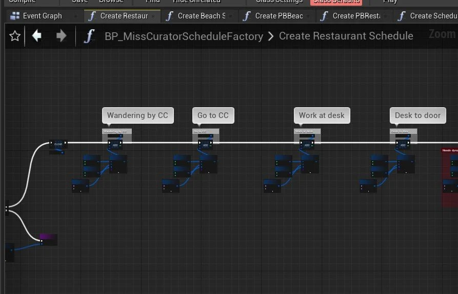 A long…long…..time ago, we mentioned our rehaul of the NPC schedule system. Up until now, we haven’t had a chance to implement any NPCs outside of making sure the system works. Now that the bare bones storyline is playable, I’ve been working on implementing getting a select few NPCs alive and running.